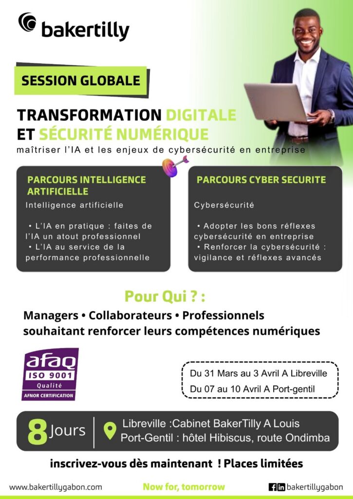 Dans cette perspective, Baker Tilly Gabon organise une session globale de formation dédiée à la transformation digitale et à la sécurité numérique, destinée aux managers, collaborateurs et professionnels souhaitant renforcer leurs compétences et accompagner la digitalisation de leurs organisations.